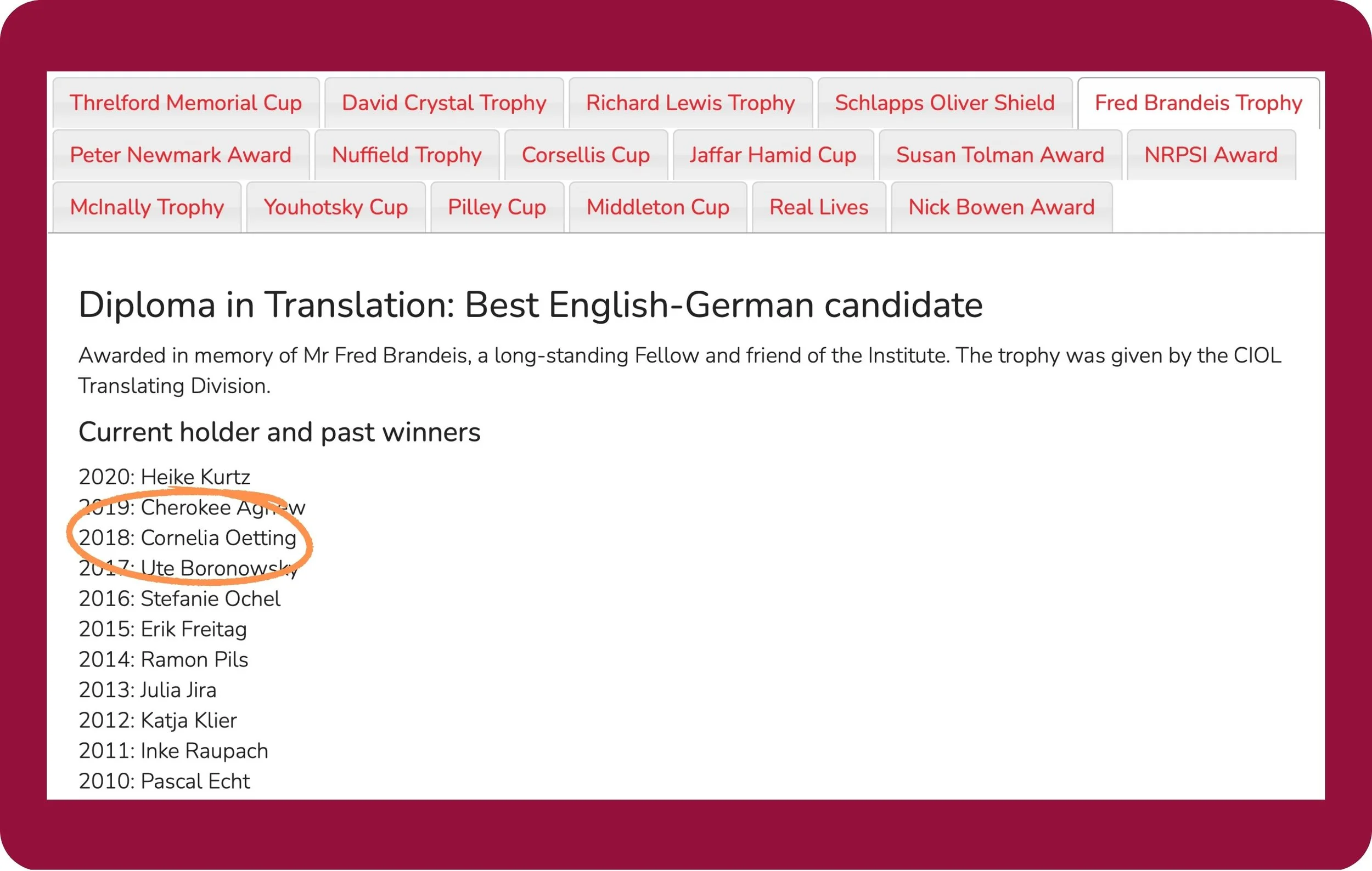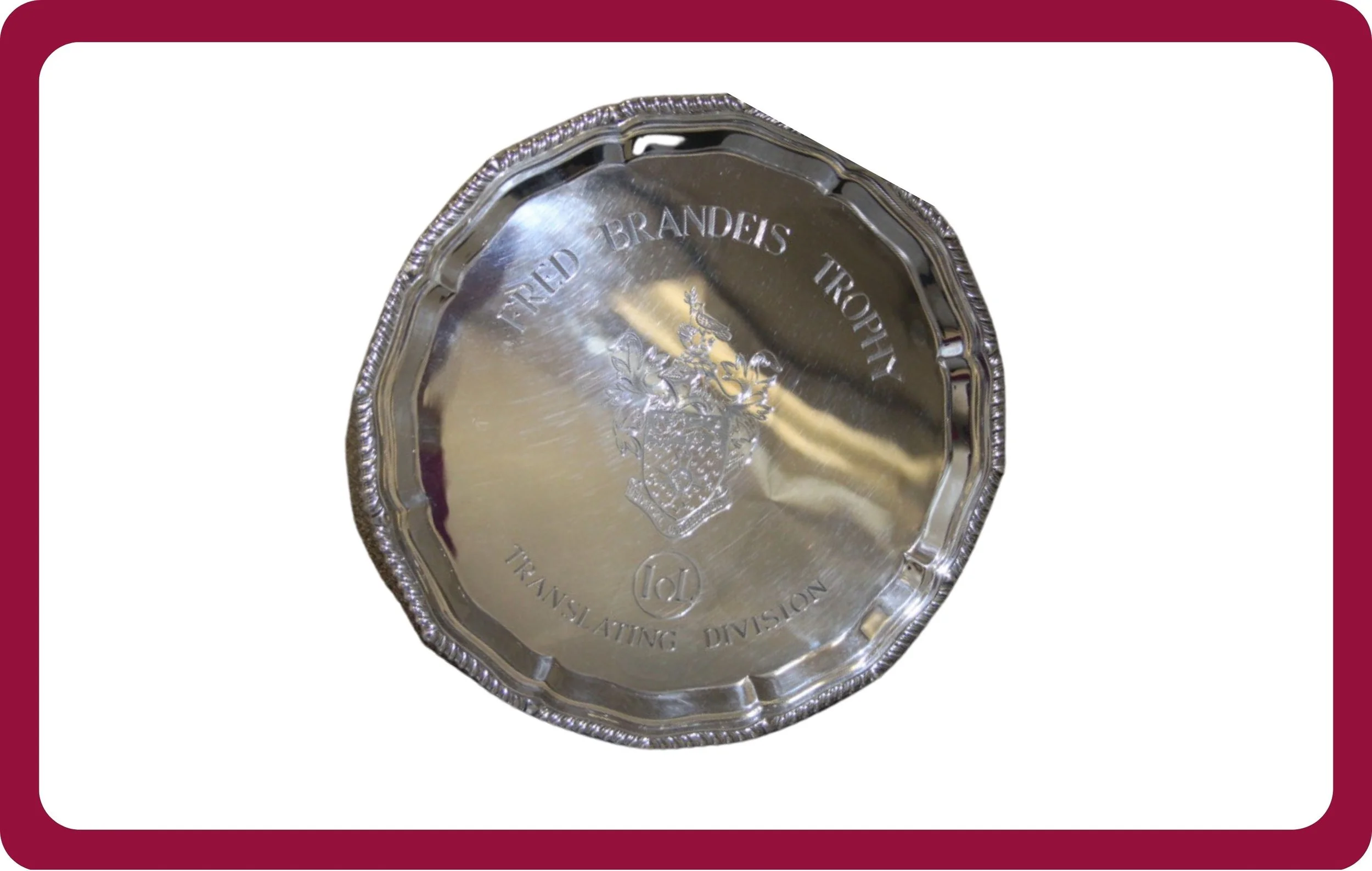 The Fred Brandeis Trophy is a prestigious award presented by the Chartered Institute of Linguists (CIOL), the UK's Royal Chartered professional body for translators and language professionals. Awarded in memory of Mr Fred Brandeis, a long-standing Fellow and friend of the Institute, the trophy was presented annually between 2010 and 2020 by the CIOL Translating Division for the best candidate in German in the Diploma in Translation (DipTrans).
