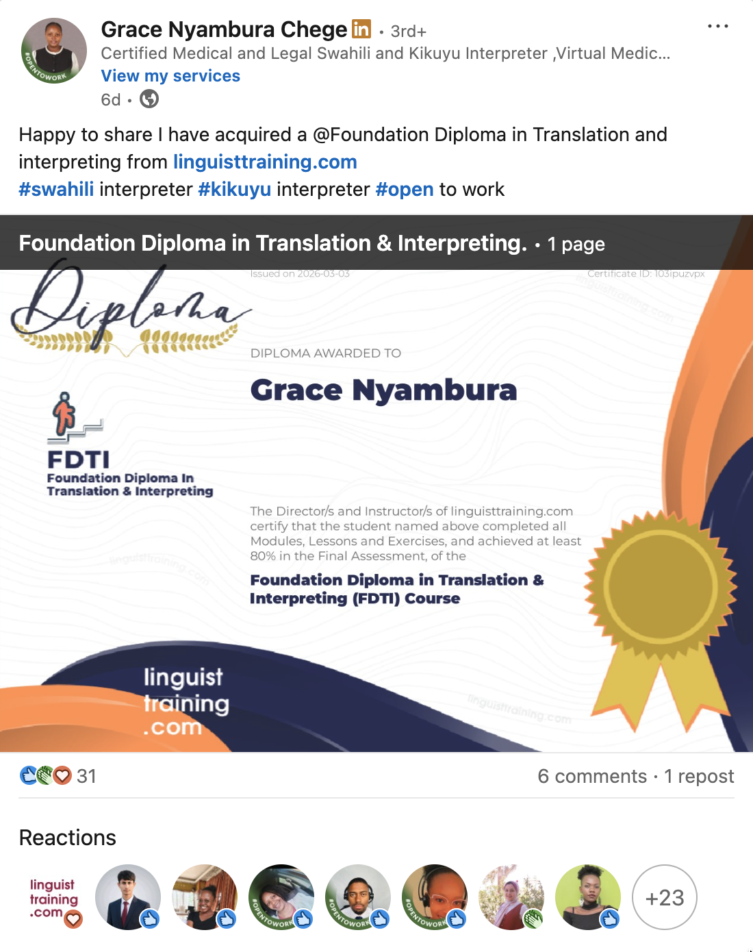"Happy to share I have acquired a Foundation Diploma in Translation and interpreting from linguisttraining.com.